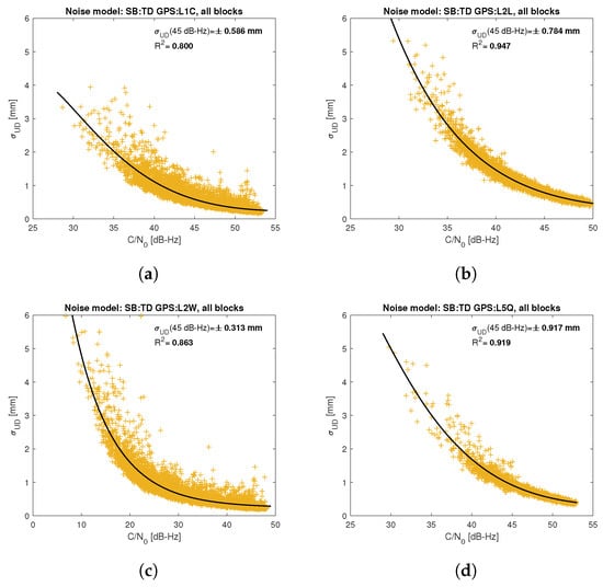 Based on the presented figures, it can be concluded that the selected approximating function accurately reflects the dependence of measurement noise standard deviation on the C/N parameter. The Figures also show the coefficient of determination , which is within the range of 0.80–0.96, proving that the model replicates the empirical standard deviation values very well. The only exception is the model for GPS C2W code observations, for which the standard deviation of the noise has a non-standard pattern—it increases along with the value of C/N to about 25 dB-Hz and then decreases. This effect may be related to a signal power loss while tracking the P(Y)-code using the Z-tracking technique []. Nevertheless, this hypothesis cannot be confirmed unequivocally. The matter should be investigated in more detail. In this case, we use the same approximating function as for the other signal modeling only for observation with C/N dB-Hz. It should be noted, however, that the observation error is much smaller than for other code observations (in all the graphs, the same scale was adopted for the code noise variance with a maximum of 0.4 m, except for C2W observations for which the maximum is 0.1 m), and the impact on the final results of the positioning model solution is significantly smaller than the one of the carrier-phase measurements. The second exception is the model for BeiDou GEO observations. The low variability of the C/N for geostationary satellites makes precise modeling difficult—for GEO L2I and L6I signals, the differences of C/N for the determined carrier-phase variances are only 4 dB-Hz.