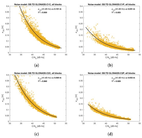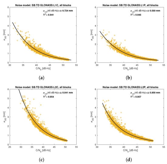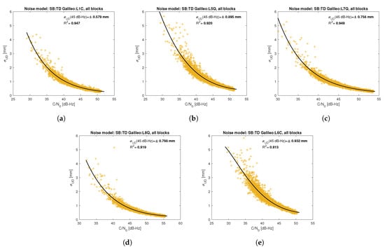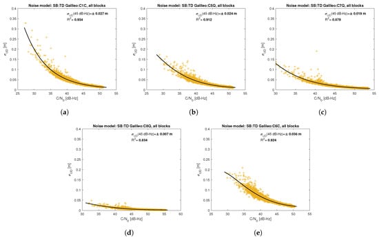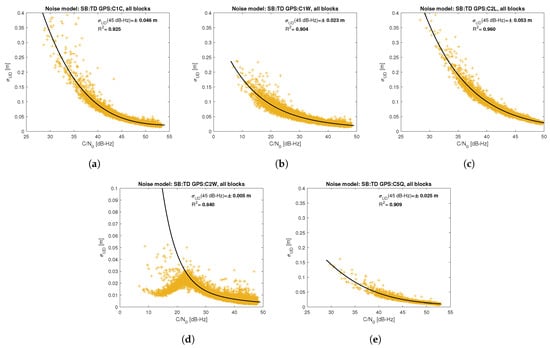Figure 5, Figure 6, Figure 7, Figure 8, Figure 9, Figure 10, Figure 11 and Figure 12 show the results of the approximation of the standard deviation of SB TD code and phase observations for all analyzed GNSS signals using the function (7). Standard deviations were determined for daily observations with an interval of 1 Hz for 120-s observation segments and recalculated to a UD level. The argument of the approximating function C/N was calculated as a mean value of carrier-to-noise density ratios of the reference satellite and the second satellite in a pair. A detailed description of the data used can be found in Section 5. Aforementioned Figures present the modeling results for all observations for a given signal with no distinction between satellite blocks. The exception is the BeiDou system, for which the degree model was adopted for observations from geostationary (GEO) satellites.