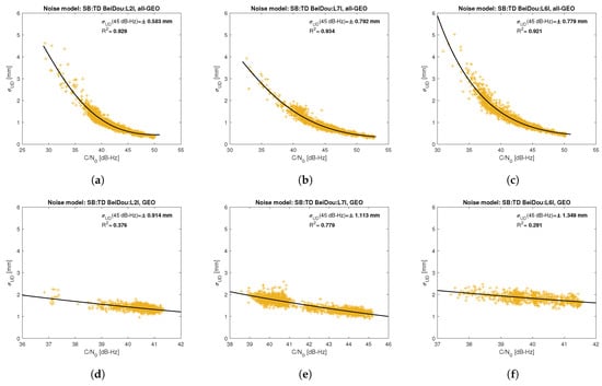 Empirical variance model for SB TD BeiDou carrier-phase measurements for signals: L2I (a), L7I (b), L6I (c) for all satellite blocks except for GEO satellite; L2I (d), L7I (e), L6I (f) for GEO satellites.