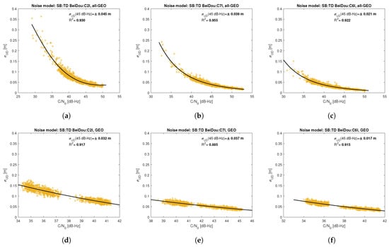 Empirical variance model for SB TD BeiDou code measurements for signals: C2I (a), C7I (b), C6I (c) for all satellite blocks except for GEO satellite; C2I (d), C7I (e), C6I (f) for GEO satellites.