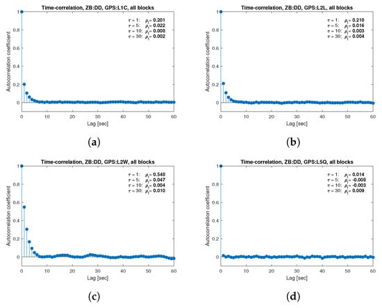 Sample autocorrelation coefficient for ZB DD GPS carrier-phase measurements for signals: L1C (a), L2L (b), L2W (c), L5Q (d).