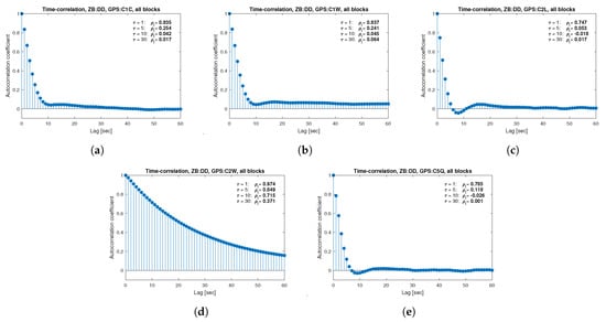 Sample autocorrelation coefficient for ZB DD GPS code measurements for signals: C1C (a), C1W (b), C2L (c), C2W (d), C5Q (e).