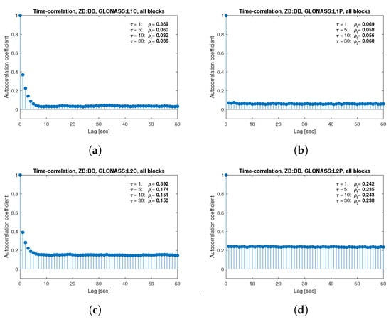 Sample autocorrelation coefficient for ZB DD GLONASS carrier-phase measurements for signals: L1C (a), L1P (b), L2C (c), L2P (d).