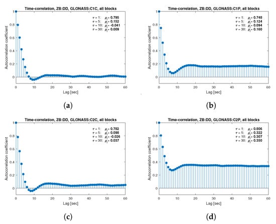 Sample autocorrelation coefficient for ZB DD GLONASS code measurements for signals: C1C (a), C1P (b), C2C (c), C2P (d).