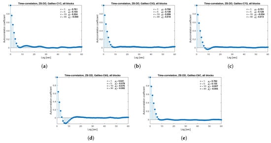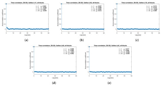 Sample autocorrelation coefficient for ZB DD Galileo carrier-phase measurements for signals: L1C (a), L5Q (b), L7Q (c), L8Q (d), L6C (e).