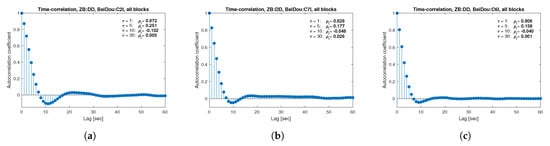 Sample autocorrelation coefficient for ZB DD BeiDou code measurements for signals: C2I (a), C7I (b), C6I (c).