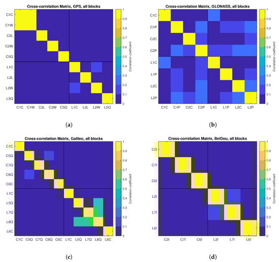 Cross-correlation coefficient matrix for ZB DD measurements for systems: GPS (a), GLONASS (b), Galileo (c), BeiDou (d).