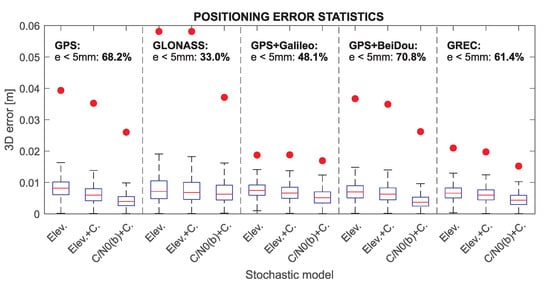 The analysis of the influence of various stochastic models on the results of the positioning model solution leads to the conclusion that their improvement (e.g., by changing the variance function or the diagonal VC matrix to the fully populated) affects: (a) the accuracy of the unknowns estimation—improvement in the accuracy of the horizontal baseline components at mm-level and height component up to a few centimeters [,]; (b) carrier-phase integer ambiguity resolution—improvement of AR success rate in GPS L1/L2 geometry-based relative positioning model up to 25% [], improving the efficiency of the AR validation test up to 10% in the case of false alarm probability using ratio test [,]; (c) overestimation of the precision—neglecting the cross-correlation leads to a too optimistic estimate of the baseline solution precision [,,].