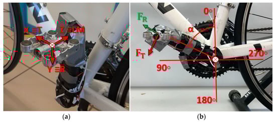 Measurement equipment details. (a) Coordinate origin and system. T: tangential direction. R: radial direction. LM: lateral-medial direction. (b) Crank rotation angle, α, with respect to a vertical line and forces components FT and FR apply to the pedal.