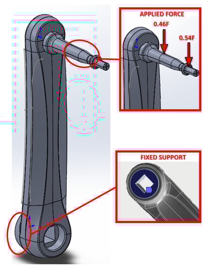 Theoretical calculations and finite element simulations were carried out to choose the optimum location for the gauges. The analyses were carried out in Ansys® 19.2 for a conventional pedal and crank. The crank model was Triban 500 and the pedal model was WPD-M17C. SolidWorks® 2018 was used to model the crank and pedal axis. The relative displacement between the pedal axis and the crank was prevented in the finite element model. As a boundary condition, the relative rotation of the crank in relation to the bottom bracket was prevented (see Figure 2). Each simulation consisted of applying a load of 98.1 N, 10 kg, in each of the defined directions. The applied force was assumed to be pointwise at the centre of the pedal. However, the transmission of this force to the pedal axis occurs via two bearings placed in the pedal axis. Therefore, in order to simplify the study of pedal axis and crank deformations, the pedal body was not included in the finite element study, although its transmitting effect of the force applied at the centre of the pedal was included. This behaviour was achieved by applying two point forces at the centre of each of the two bearings, distributed according to the geometry of the pedal and the position of the bearings, Figure 2. The two bearings were not exactly the same and were not equidistant from the point of application of the point force, the outer bearing being closer to the point of application than the inner bearing. Making a simple calculation considering the central point of the two bearings, the proportion of the applied point force F that was transmitted to the shaft by each bearing was obtained, being 0.54F in the outer bearing and 0.46F in the inner bearing. In any case, the way in which the force on the pedal was transmitted to the pedal axis was an intrinsic characteristic of the type of pedal and axis used, without affecting the general methodology undertaken in this work.