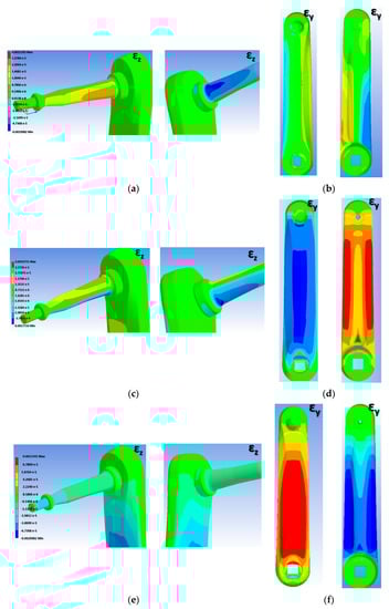 Pedal and crank strain mapping. (a) Strain in z direction (εz) when FT is applied. (b) Strain in y direction (εy) when FT is applied. (c) Strain in z direction (εz) when FR is applied. (d) Strain in y direction (εy) when FR is applied. (e) Strain in z direction (εz) when FLM is applied. (f) Strain in y direction (εy) when FLM is applied.