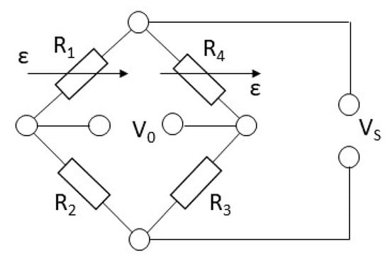 Wheatstone bridge circuit diagram. Half-bridge configuration. Vs: input voltage. Vo: output voltage. Ri: resistance i. ε: indicates which resistances represent strain gauges.