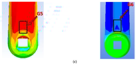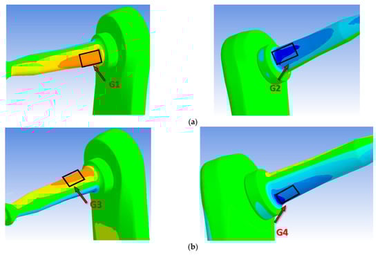 Table 1 shows the values in micro-deformations provided by each gauge when a 10 kg weight is applied in the three directions: tangential, radial, and lateral-medial. The analysis of the results shown in Table 1 indicate that when the weight is loaded in the tangential direction, gauges G1 and G2 undergo the greatest deformation, Figure 3a, with practically equal values, but with the opposite sign due to the axis being subjected to bending. The rest of the gauges showed values close to zero. These results are coherent since for this state of stresses the areas where the gauges are located for bridges 2 and 3 should hardly suffer any deformation. In any case, the values shown in Table 1 are an average of the deformations obtained in the concurrent nodes in the area where the gauge is placed. The signal from gauges G1 and G2 give measurement values close to zero when load is applied in the radial direction, Figure 3c. In this case the area where gauges G3 and G4 are installed will be under bending, as will the area where gauges G5 and G6 are located, Figure 3d. Therefore, the signal of both bridges will be significant The results shown in Table 1 show for this case how the strain values obtained are practically the same and of opposite sign in the gauges of these two bridges. Finally, when the load is exerted in the lateral-medial direction, Figure 3f, gauges G5 and G6 will be under bending stresses, which is the reason why the deformations obtained in the areas where these gauges are placed are greater. Likewise, it can be seen that the deformations are the same, but of opposite sign. The deformations measured in the areas where gauges G1 to G4 are placed are very small because the pedal axis is axially stressed and the stiffness is very high, Figure 3e. However, these results are consistent because the deformations in the four gauges of the pedal axis are equal and negative due to the axis being subjected to compressive stress.