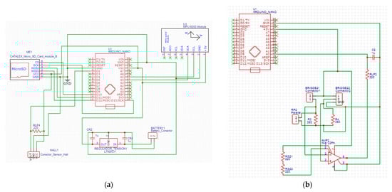 Diagram of the elements used in the PCB. (a) Power supply and data storage circuit with voltage regulator. (b) Half-Wheatstone bridge measurement circuit with low-pass filter.