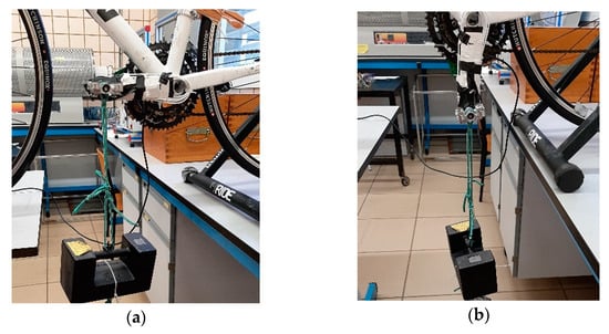 For the validation of the dynamic tests, the pedalling of a series of participants was analysed. The tests were carried out on the Triban 500 commercial bicycle, which was mounted on an Elite Roller training roller. The bicycle was equipped with clipless pedals, and the participants wore shoes with cleats. Saddle height was calculated using the methodology developed by Holmes et al. []. The pedalling cadence was set to 60 rpm, controlled by an acoustic signal. The pedalling power was set to 150 W and was guaranteed by the set cadence, the gear ratio setting and the resistance of the training roller. The hands were placed at the top position of the handlebars.