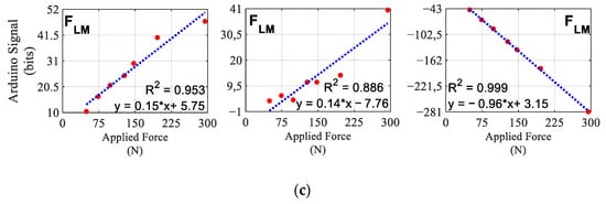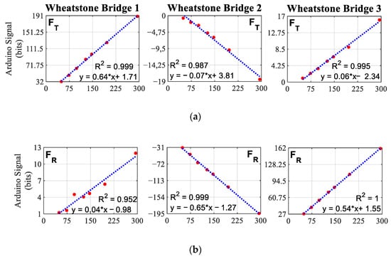 The hypothesis of the linear behaviour of the measuring device is supported by the regression lines and the value of the correlation coefficient R2 shown in Figure 9. This figure shows the regression lines of the signal obtained in each bridge as a function of the load applied in each of the three directions of space. In this figure, when the tangential direction test is carried out, Figure 9a, Wheatstone bridge 1, which is the bridge responsible for measuring forces in that direction, shows an R2 of 0.999 and a maximum value in bits of 191. For that same test, the rest of the signals reach values of less than ±20 bits, close to 10% in relation to the signal measured by the main bridge in that direction. The value of R2 for these two bridges is 0.987 for bridge 2 and 0.995 for bridge 3, showing a high linearity in their behaviour, although lower than that of bridge 1.