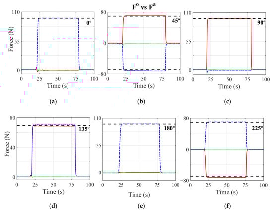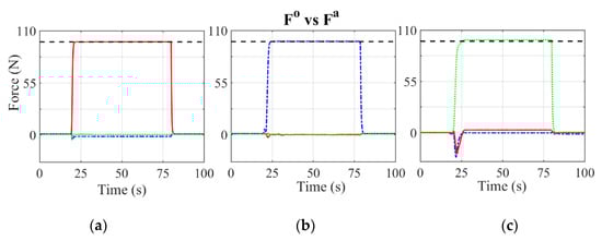 Figure 10 shows visually the behaviour of the evolution of the three force components for tests with a weight of 10 kg applied in each direction of the space, and Table 5 shows the global mean-square error of these tests. The value of the applied force is represented by a dotted black line. This type of test is used to determine the accuracy of the Mmean matrix. The time evolution of the force components shows that for all cases, when no force is applied, the value of the three components is zero. When a force is applied in one of the space directions, the bridge signal responsible for measuring that component is the one that is activated approaching the theoretical force value; the rest of the components remain close to a zero or residual value. In Figure 10, some small peaks can be seen at the beginning of the force measurement; this behaviour is due to the instant of application of the weight, and this effect becomes significant for Figure 10c.
