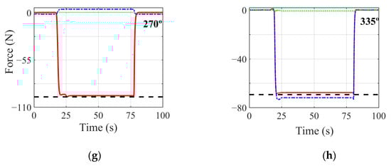 Measured forces (F0) in the tangential, radial and lateral-medial directions for the 10 kg calibration weight along different positions of the crank. Fa is the theoretical weight in N. (a) Weight applied when the crank is at 0°. (b) Crank is at 45°. (c) Crank is at 90°. (d) Crank is at 135°. (e) Crank at bottom dead centre, 180°. (f) Crank is at 225°. (g) Crank is at 270°. (h) Crank positioned at 335°. Red solid line: tangential force. Blue dashed dotted line: radial force. Green dotted line: lateral-medial Force. Black dashed line: calibration weight.