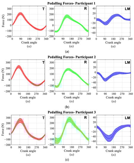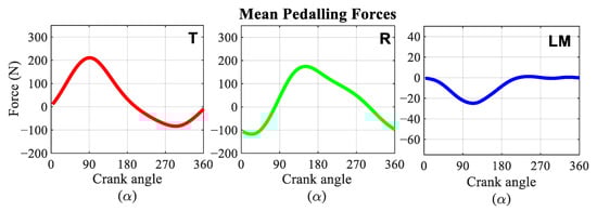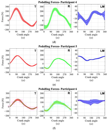 Figure 12 shows the average and standard deviation of each forces component during the pedal cycle of the six analysed participants. The graphs were normalised to show the crank angle, and the origin of the cycle was chosen at the top dead centre of the crank. All the participants exerted zero effective force, FT, at the beginning of the cycle. This force component reached its maximum value when the crank reached a position of 90° with respect to the vertical. It returned to zero at bottom dead centre and reached its minimum value when the crank was at 270°. Most of the participants exerted a maximum effective force of about 250 N, with the exception of participants 5 and 6, who exerted about 200 N and 150 N, respectively. The same tendency existed for the minimum force; these participants exerted a force close to −50 N while the rest of the participants applied a minimum effective force of −100 N. The radial force started the pedalling cycle near its minimum value and reached its maximum near the bottom dead centre. This component became zero when the crank was located near the 90° and 270° position. This component showed a greater difference between participants. Participants 1 and 2 exerted a maximum force limited between 150 and 200 N and a minimum force close to −150 N. Participants 3 and 4 were the ones who exerted the highest FR, reaching values close to 250 N. For these participants, the minimum value of the force is similar to the two previous participants, −150 N. Participants 5 and 6, as with the previous component, were those who exerted the least force for this component, with values close to 100 N for the maximum and −100 N for the minimum.