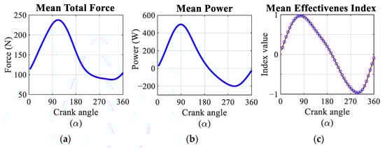 It was also of interest in this study to analyse the temporal evolution of the effectiveness index throughout a pedalling cycle, for which Equations (10) and (11) were applied.
