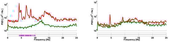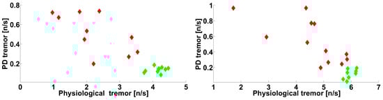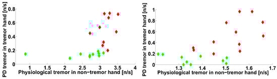 Let us consider the spectra of envelopes of EMG signals collected from PD patients and healthy volunteers (see Figure 1). On the left, an average spectrum of the tremor right hands of twelve PD patients and an average spectrum of the right hands of ten healthy volunteers are demonstrated. On the right, an average spectrum of the non-tremor left hands of the PD patients and an average spectrum of the left hands of the healthy volunteers are demonstrated. Three peaks are observed in the 4–10 Hz frequency range in the left figure. Two peaks are observed in this frequency range in the right figure. The Mann–Whitney statistical test discovers statistically significant differences in the spectra of the PD patients only in the tremor hands (see the left figure). These differences are well-known physiological regularity and are used for the diagnosis of PD []. However, the statistically significant differences between the spectra are not observed in the right figure. Therefore, the conventional spectral analysis does not reveal diagnostic features of PD in the non-tremor hands of the PD patients. In this paper, we will demonstrate that our method extracts much more information from the signals. In particular, statistically significant differences will be demonstrated between EMG signals collected from the non-tremor hands of the PD patients and healthy volunteers.