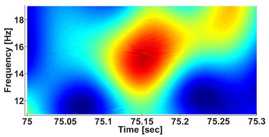 Let us consider an example of a wave train on a wavelet spectrogram of EMG signal in an extensor muscle of the non-tremor (right) arm of a patient with the left-side tremor of the body (Figure 3). The central frequency of the wave train is 15.2 Hz; the signal is clearly distinguished in the time–frequency space.