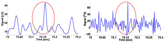 On the left is the envelope of the EMG signal considered in Figure 3. The abscissa axis indicates the time; the ordinate axis indicates the envelope of the signal in V. On the right is the source EMG signal. The abscissa axis indicates the time; the ordinate axis indicates the amplitude of the signal in V. The wave train is indicated by the red circle in both figures.