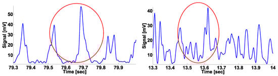 On the left: the envelope of the EMG signal in the tremor left hand of a PD patient. On the right: the envelope of the EMG signal in the left hand of a healthy volunteer. The wave trains are indicated by the red circles. The abscissa axis indicates the time; the ordinate axis indicates the envelope of the signal in V. The wave trains are very similar. We do not try to distinguish “normal” and “abnormal” wave trains. Instead, we use a statistical analysis based on the number of detected wave trains.