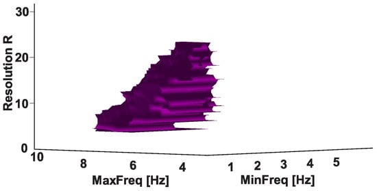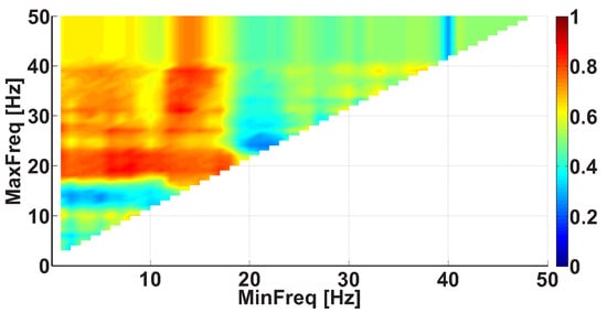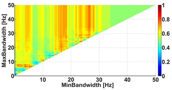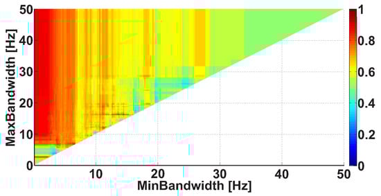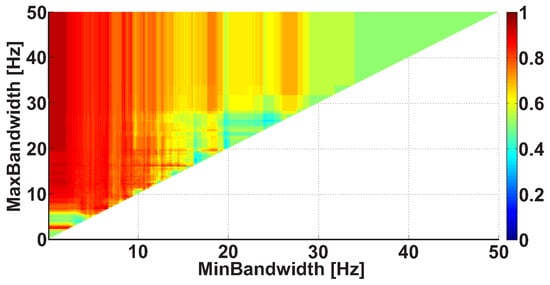 Let us consider an example of a Bandwidth AUC diagram (Figure 10). The diagram is based on the same dataset. In the Bandwidth AUC diagram, the ranges of bandwidth of the wave trains are considered. The bandwidth range is characterized by the lower and upper range bounds. The abscissa axis indicates the lower bound of the range, while the ordinate axis indicates the upper bound of the range. In this example, the frequency bands in the interval from 0 to 50 Hz are considered; the step size is 0.1 Hz.
