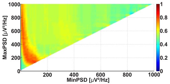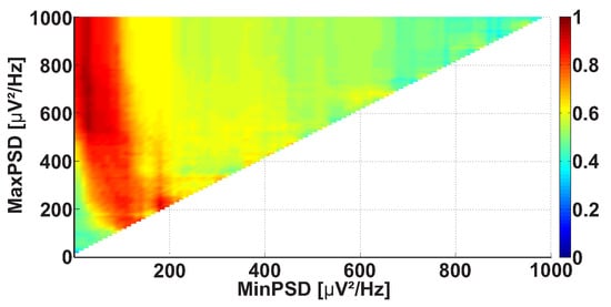 Figure 12 demonstrates the Power spectral density AUC diagram for the wave trains that belong to the frequency interval from 8 to 20 Hz. The diagram differs from Figure 8 because the frequency band of the considered wave trains is narrowed. The colored areas in Figure 12 are brighter, but the size and position of the areas are approximately the same. This means that the applied frequency constraint allows the better recognition of the differences between the groups of subjects. The diagram demonstrates the most substantial differences between the patients and control subjects in the following point: the PSD range from 30 to 700 V Hz (AUC = 0.96). The maximal PSD of the wave trains may be a hardware-dependent characteristic; thus, one can consider only the wave trains with a PSD above 30 V Hz in the further steps of the analysis.