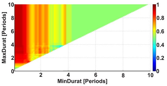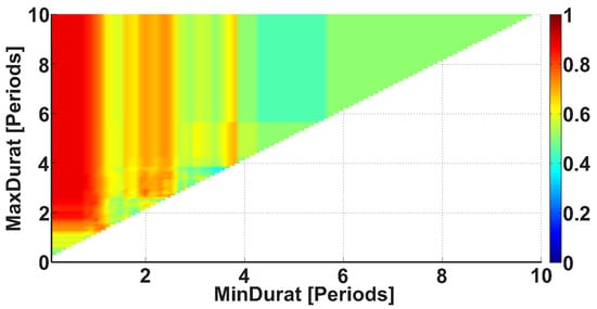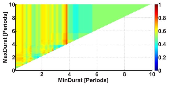 The third type of AUC diagrams is the Duration AUC diagram. Let us consider an example of the Duration AUC diagram (see Figure 9). The diagram is based on the same dataset as the previous diagrams; however, the ranges of wave train durations are considered. As in previous figures, the duration range is characterized by the lower and upper bounds of the range. The abscissa indicates the lower bound of the range, while the ordinate indicates the upper bound of the range. The duration of the wave trains is considered in the interval from 0 to 10 periods with 0.1 period steps.