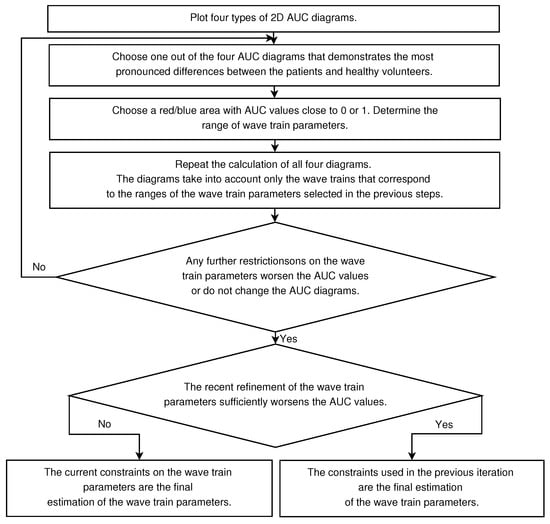 The analysis of the wave train electrical activity begins with the calculation of AUC diagrams of all four types (see Figure 7, Figure 8, Figure 9 and Figure 10). At the first stage of the analysis, one has to choose one out of four diagrams that demonstrates the most pronounced differences between the patients and healthy volunteers—that is, the diagram that contains the most prominent red or blue area with AUC values close to 0 or 1. The selected red/blue area corresponds to a certain range of the corresponding parameter. The calculation of all four diagrams is repeated in the next steps of the analysis. However, only the wave trains that correspond to the ranges of the wave train parameters selected in the previous steps are taken into account. It is possible to identify interesting ranges of all four parameters of the wave trains (the central frequency, PSD, duration in periods, and bandwidth) by iteratively repeating the described operations (see the flowchart in Figure 11).