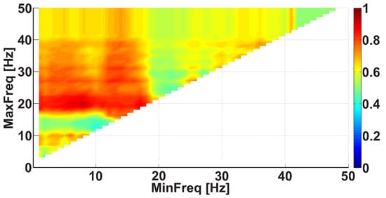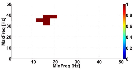 Figure 15 demonstrates the Frequency AUC diagram with a PSD that is no less than 30 V Hz. Note that the frequency constraint needs to be refined using this diagram. The Frequency AUC diagram (see Figure 15) has changed substantially in comparison with that of Figure 7. The red areas in Figure 15 are brighter and larger. The blue areas have disappeared. Thus, the applied constraints made the differences between the groups of subjects more contrasting. The diagram demonstrates the strongest differences between the patients and control subjects in the frequency range from 8 to 20 Hz; the AUC value is equal to 0.93. Note that the disappearing blue area may correspond to another statistical regularity that differentiates the groups of subjects; however, this regularity is out of the scope of this paper.