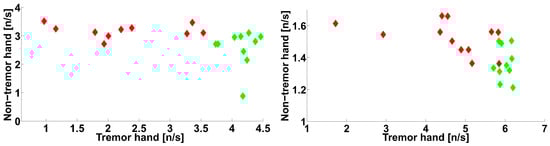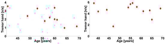 The object of our investigation is the electromyographic signals in PD patients at the first stage of the disease according to the classical Hoehn–Yahr scale. Approximately half of the patients had never taken antiparkinsonian drugs before, and the other patients had not taken antiparkinsonian drugs for one to two days before the investigation. Additionally, a group of healthy volunteers participated in the investigation. The average age of the patients was 56 years (the minimum age was 38 years; the maximum age was 69 years). The average age of the healthy volunteers was 51 years (the minimum age was 24 years; the maximum age was 71 years). There were no statistically significant differences between the ages of the patients and the healthy volunteers (the Mann–Whitney test was used). Note that the group of PD patients included patients with left-hand tremor (10 persons) and patients with right-hand tremor (12 persons), with 22 persons in total (see Figure 2). All the patients were examined at the FSBI Research Center of Neurology, and PD was diagnosed. The number of healthy volunteers was 10 persons. All patients and healthy volunteers were right-handed.