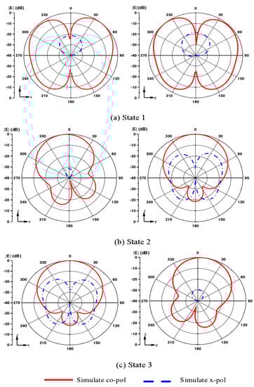 Radiation pattern in (a) working state 1, (b) working state 2, (c) working state 3.