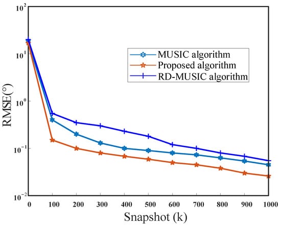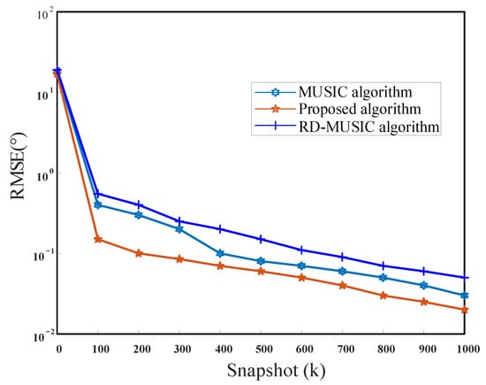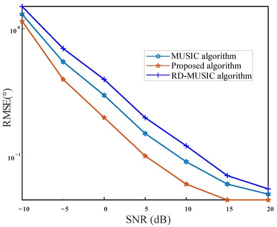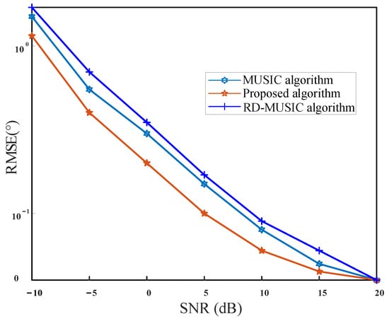 A simulation was implemented to compare the DOA estimation performances of the MUSIC algorithm, the RD-MUSIC algorithm, and the proposed algorithm. We considered two incoherent signals to be incidental to the array. The theta angle is , the phi angle is , and the corresponding TD angle is , . The Monte Carlo number is = 500 and the shifts from −10 to 20 dB. The root-mean-squared error (RMSE) was used to measure the effectiveness of these three algorithms, which was defined as