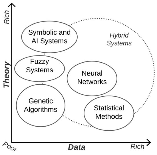 Using these techniques is in line with the Theory of Intelligent Systems [], illustrated in Figure 3, where the ideal scenario of applying the Genetic Algorithm is positioned in a middle path where there is not much data available and the theory on the problem is not notably high. Alternatives such as Convolutional Neural Networks and Deep Neural Networks, on the other hand, could perform better when working with a larger amount of data.
