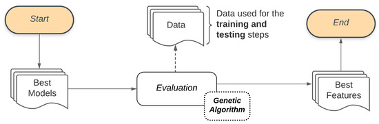 We use a Genetic Algorithm to manage the Bucket of Models. A Genetic Algorithm works generating successive new populations that are a set of individuals, and each individual represents a model. Thus, a Genetic Algorithm provides a Final Set, which in this stage refers to the set of models that best adapt to the classification problem. Figure 4 illustrates the process adopted by the Bucket of Models in our study. Combining the Base Classifier with the Set of parameters will generate the Possible Models to be used in the Evaluation process through the Genetic Algorithm. To evaluate these models, the Genetic Algorithm will also use the set of features that describes the classification problem as input Data. These data are used for training and performance evaluation of each generation of the Genetic Algorithm models. The models resulting from this process will be used in the subsequent step of this methodology (feature selection).