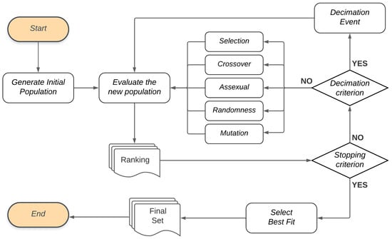 In addition to this proposal of using GA, this study also considers the occurrence of . When these events happen, few individuals survive and the rest are randomly created. In this proposal, such events happen if the solution set has presented the same performance for several generations, and we call this . Figure 6 illustrates the general flow of the genetic algorithms proposed in this work.