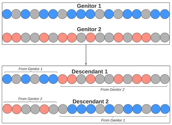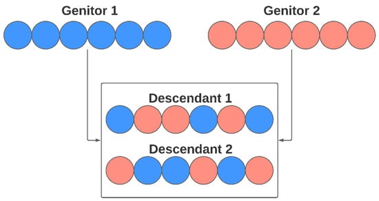 In the Crossover stage, genes are modified following the concept of heredity, where the genetic load of the new individual is formed from their parents’ genes. In the approach proposed in this work, each descendant receives, at random, genes from both parents. The genetic load is configured to be balanced, receiving the same number of genes from each parent in case of even numbers of them—or almost a similar number of parameters in case of odd numbers of elements. Figure 7 illustrates the crossover process for the genetic algorithm used for the model selection. The number of individuals generated by crossover, in each generation, can be configured by the user.