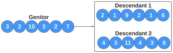 In asexual reproduction, an individual’s DNA is altered. Thus, this change makes him a new individual in conceptual terms. In this work, this reproduction method refers to the alteration of the values of each model’s parameters (genes). Assuming that a gene X has the value n, the reproduction will generate two new individuals, where, in one of them, gene X has the value , and, in another, it produces the value . This process is repeated for all genes, and represents a fine-tuning of some individuals in the population (the most adapted in the current population) to improve individual performance. In the task of manually adjusting the estimator parameters, the researcher sometimes updates the model with small variations in the parameters. This step tested in our study simulates this behavior. Figure 8 illustrates the flow of the evolution of individuals based on asexual reproduction. In this work, the number of new individuals generated by each of these approaches can also be configured by the user.