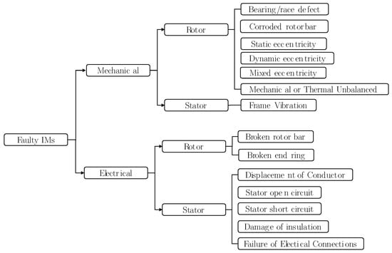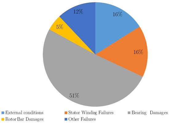 Induction machines (IMs) are widely used in industry applications because of their reduced cost, robustness and reliability. However, induction machines (IMs) are not free from failure. The main sources of faults in IMs can be internal, external or due to environmental conditions. Various perspectives can be found in the literature to categorise the IMs faults. For example, internal faults are usually classified according to their origin, i.e., electrical and mechanical, or to their outbreak location, i.e., stator and rotor []. Figure 1 shows a fault tree where faults in IMs are categorised according to their origin (mechanical or electrical) and location (stator or rotor). Some of these failures cause downtimes of the machines which could cause unexpected stoppages leading to important economical loses. Figure 2 illustrates the common reasons for downtimes of IMs. As can be seen, bearing related failures are responsible for 51% of the downtime of IMs. They are followed by those related to stator winding and external conditions damages, which each account for 16% of faults. Rotor-related failures represent 5% and other damages 12% [,]. Bearing- and stator-related faults are the most common type of faults, which together account for over 60% of the downtime of electrical machines. Moreover, defective bearings can increase power consumption of IMs whereas efficiency decreases []. As such, the literature focuses on the conditioning monitoring systems and the development of fault diagnosis techniques with the aim to detect these faults at an early stage and to track their evolution. Therefore, the maintenance tasks can be scheduled and the outage time imposed by sudden breakdown can be reduced []. With this purpose, there are many published condition monitoring techniques based on the analysis of different magnitudes such as thermal [], chemical, acoustic [], torque analysis, induced voltage analysis, partial discharge analysis [], vibration analysis [], or motor 35 current signature analysis (MCSA) [,]. The reliability of condition monitoring systems is based on understanding the behaviour of the machine in healthy and faulty status working under different conditions. The development of the techniques usually involves the analysis of data coming from simulated models and the identification of fault signatures. However, as IMs are key components, it is not only necessary to identify the presence or absence of a given fault, but it must also be quantified. The severity degree of the fault must be indicated in order to plan maintenance tasks. For this purpose, the use of artificial intelligence applied to the fault diagnosis of IMs has been proposed in the recent years.