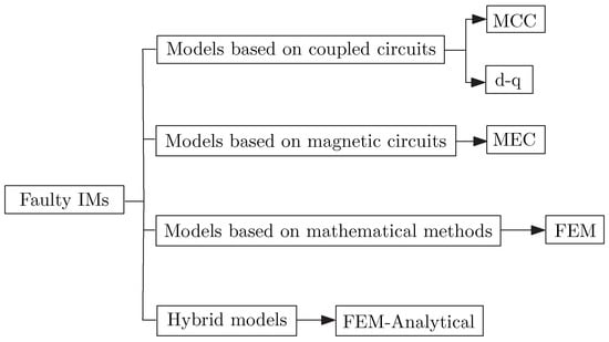 This paper presents a review of the most recent advances in the development of IM faulty models, breaking down into four broad categories, as illustrated in Figure 3. The categories can be further classified as models based on electrical circuits, models based on magnetic circuits, models based on numerical methods and hybrid models. For each type of model, various fault diagnosis methods are covered and a number of summary tables are presented at the end of the subsections dealing with some of the approaches to summarise the references to pertinent works.