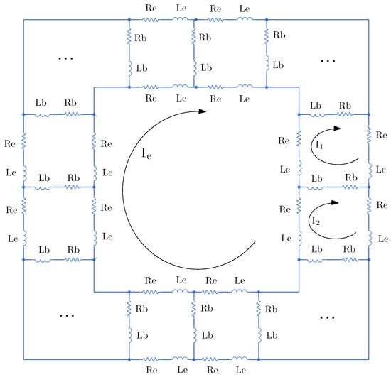 The detailed modelling procedure as well as the simulation results of models based on coupled circuits are included in [,]. The multiple coupled circuit (MCC) models are developed considering that both the stator and rotor are multiple inductive circuits coupled together, with the current in each circuit being an independent variable. Figure 4 shows the rotor cage described as a mesh, where and are the resistance and leakage inductance of the end ring segment, respectively; and are the rotor bar resistance and leakage inductance, respectively; is the end ring current; and and are the currents of the first and second rotor loop, respectively. It can be observed that the rotor loop comprises two adjacent rotor bars together with the corresponding end ring segments []. Besides, the n rotor loop currents are coupled to each other and to the stator windings through mutual inductances. The end-ring loop does not couple with the stator windings; it, however, couples the rotor currents only through the end leakage inductance and the end-ring resistance []. Thus, the MCC method can be used to represent a wide variety of fault modes without modification of the model structure shown in Figure 4. In some cases, it only requires the modification of the values of the elements of the circuit in order to introduce the new fault. As an example, a rotor broken bar implies a large value of resistance associated to the broken bar.