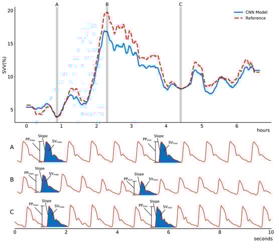 Representative plot of estimated stroke volume variance (SVV) using the proposed convolutional neural network model compared with that of a reference (EV1000, Edward, LifeScience) in (A) stable phase, (B) hypovolemic state due to massive intraoperative bleeding, and (C) recovery phase during intraoperative period. The proposed model shows high correlation to the reference value. Abbreviation: PPmax, maximum pulse pressure during one ventilation cycle; PPmin, minimum pulse pressure during one ventilation cycle; SVmax, maximum stroke volume during one ventilation cycle; SVmin, minimum stroke volume during one ventilation cycle.