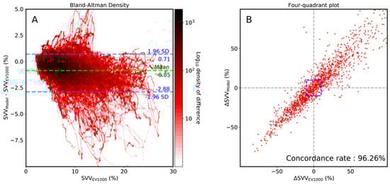 Bland-Altman density plot (A) and four-quadrant (B) plot analysis between stroke volume variance (SVV) of the proposed model and that of EV1000 (Edward, LifeScience). The central blue zone is excluded in the four-quadrant plot.