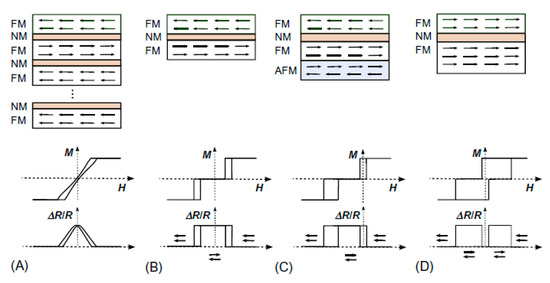 In Figure 5, we show several types of GMR spin valves [,] developed after the discovery of the GMR effect. The bilayer spin valve (Figure 5B) is essentially like the typical spin valve described previously. If we tune its magnetic properties, it is possible to optimize the magnetic response, allowing us to obtain two possible bit states, “0” for antiferromagnetic (AF) orientation (maximum resistance) and “1” for ferromagnetic (FM) orientation (minimum resistance), well-suited for magnetic recording and memory. In the case of the multilayer spin valve (Figure 5A), the GMR is higher than in the bilayer one, as there are more interfaces contributing to the spin-dependent electron scattering phenomenon []. The fact that both magnetic layers are strongly AF coupled gives rise to noncollinear relative orientations in each layer, limiting its efficiency. Hence, the exchange bias spin valves (Figure 5C) were developed, in which an AF layer was grown close to one of the FM layers. The exchange interaction between these two layers prevents the moment of this FM layer (“pinned layer”) from following the external field (exchange bias mechanism), presenting therefore an unidirectional anisotropy and higher coercivity [,], whereas the other FM layer is practically free to follow the external applied field (therefore called “free layer”). Finally, another possibility is the pseudo spin valve (Figure 5D) [], where the magnetic layers have different coercivities (i.e., one is a soft magnetic material and the other is a hard one), providing a window of field values in which the magnetization of the layers are opposites [,]. In that case, the soft magnetic layer is called the free layer and the hard one is called the fixed or pinned layer.