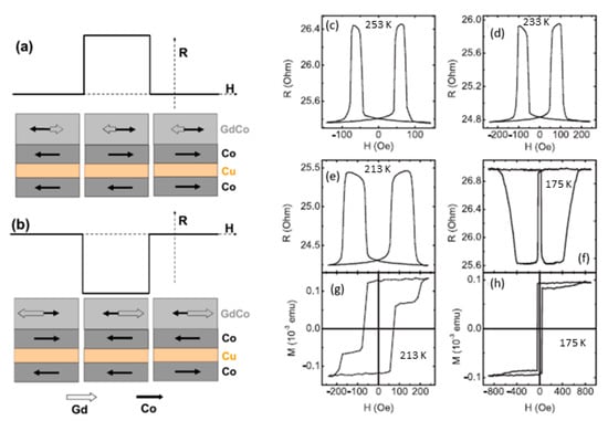 Schematic configurations of the magnetic moments of pure Co layers and Co and Gd sublattices of the Gd-Co layer, where the moment of Co total subnetwork is larger than that of Gd sublattices of the Gd-Co(35 nm)/Co(7 nm) composite layer at a temperature above the Tcomp (a) and vice versa, at a temperature below Tcomp (b). Magnetoresistance (c–f) and magnetic moment (g,h) loops for the Gd-Co(35 nm)/Co(7 nm)/Cu(4 nm)/Co(7 nm) spin valve measured at different temperatures: 253 K (c), 233 K (d), 213 K (e,g), and 175 K (f,h). The upper GdCo/Co bilayer act as the fixed layer in the spin valve, and the lower Co layer acts as the free one. Reprinted with permission from ref. [] 2016 Elsevier with permission.