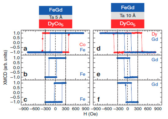 In the case of heterostructures such as bilayers and multilayers made up of RE and TM, the antiparallel coupling at the interfaces determines the magnetic structure of the whole material as well, yielding an artificial ferrimagnet that shares most of the properties of the alloys (see Figure 3 and Figure 4c). The additional freedom of choosing the thicknesses (and sometimes composition and doping []) of the layers provides further tunability: the composition in the case of the alloy corresponds to the ratio of thicknesses of the RE and TM layers, facilitating the positioning of Tcomp at the desired value []. For example, in Figure 4b the compensation of magnetization is also achieved in ferrimagnetic multilayers by changing the thickness of the Co layers while the other is kept fixed. A drawback of these structures resides in the affinity of TM and RE for mix up at the interfaces [], which, to make things worse, is asymmetric []. This smears out the properties, so much effort was directed towards the quantification and limitation of its extent. A successful strategy was replacing the RE layer by an alloy where RE still dominates the magnetization of that layer [,,].