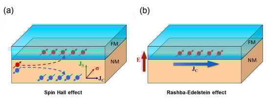 The simplest SOT device consists of a bilayer made of a non-magnetic metal (NM) and a ferromagnet (FM). When an electrical current flows in the plane of the NM thin film, a transverse spin current is generated due to the spin–orbit coupling. This causes an accumulation of spin in the NM/FM interface that exerts a torque on the magnetization of the FM. The detailed mechanism that causes this accumulation of spins at the interface is still under debate, but basically it combines the spin Hall effect (SHE) and the interface Rashba–Edelstein effect [,,]. In the spin Hall effect, an unpolarized current passes through a material with a high bulk spin–orbit coupling (SOC). Electrons with different spin are deflected in opposite directions; this deflection between spin-up and spin-down creates a transverse spin current and generates a spin accumulation at the NM/FM interface (Figure 8a). This bulk effect in the NM arises from the band structure of the metal and can also be caused by the presence of high SOC impurities. On the other hand, the Rashba–Edelstein is an interfacial SOC phenomenon. In structures with broken symmetry (e.g., bilayers of different materials), an electrical field is generated perpendicularly to the interface. Electrons moving close to this interface experience an effective magnetic field that couples to the spin of the conduction electrons and polarizes their moments parallel to the interface (Figure 8b).
